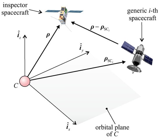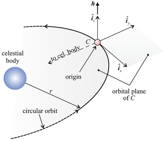 Consider the generic i-th arc, which starts (or ends) at time (or ). In that arc, the IS dynamics relative to the formation may be described by introducing a local–vertical–local–horizontal (or Hill’s) reference frame of origin C in which unit vector is aligned with the celestial body-C line, the plane coincides with the orbital plane of virtual chief C, and unit vector is aligned with ; see Figure 3. is opposite to the motion direction of C along its circular orbit, while frame rotates around the (inertially fixed) direction of with a period equal to .