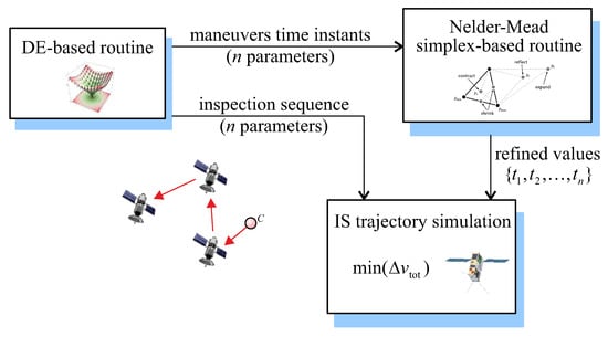 In the proposed two-step procedure, a DE-based method is first used to rapidly obtain an initial guess of the control vector that allows for the actual minimal value of the total velocity variation to be roughly estimated. Then, the n components of that define the optimal sequence of inspected formation elements is maintained constant, while the other n components that give maneuver time instants are further refined through a Nelder–Mead simplex-based optimization algorithm, as illustrated in Figure 7.