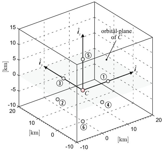 The components of generic spacecraft position vector are summarized in Table 1, where labels are used to identify the spacecraft in the formation structure; see also Figure 8. Clearly, the distance between virtual chief C and the generic formation element was much smaller than the distance between the spacecraft and Earth’s center of mass (which is about ). Hill–Clohessy–Wiltshire Equations (1)–(3) used in the proposed procedure are, therefore, consistent with the actual dynamics of the IS that, at time , is at the origin of rotating reference frame (point C).