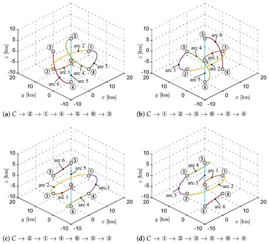The procedure proposed in this work gave a minimal total velocity variation of , a value consistent with the current technology readiness level (see, for example, the VACCO green propellant integrated propulsion system []). In principle, the value of total velocity variation, which was obtained by enforcing a maximal travel time of along each leg of the IS trajectory, may be reduced by extending the duration of the entire maneuver. However, the computed value of was reduced by only a few meters per second when the maximal travel time was increased up to 24 h. To validate our model, the total velocity variation computed with the HCW model was compared with that obtained with a Keplerian motion model. In particular, by solving a series of Lambert’s targeting problems using the optimal sequence of inspected spacecraft and the flight time along each leg computed with the proposed approach, we found a total velocity variation of , which is very close to the value obtained with the HCW model. Notably, the optimization of performance index J was obtained with a calculation time that was about one order of magnitude smaller than that required by the method discussed in []. The minimal value of velocity variation was reached in four different inspection sequences, as summarized in Table 2, a result that is consistent with the geometric symmetry in the formation structure. The IS inspected trajectories in the four optimal sequences described in Table 2 are shown in Figure 9.