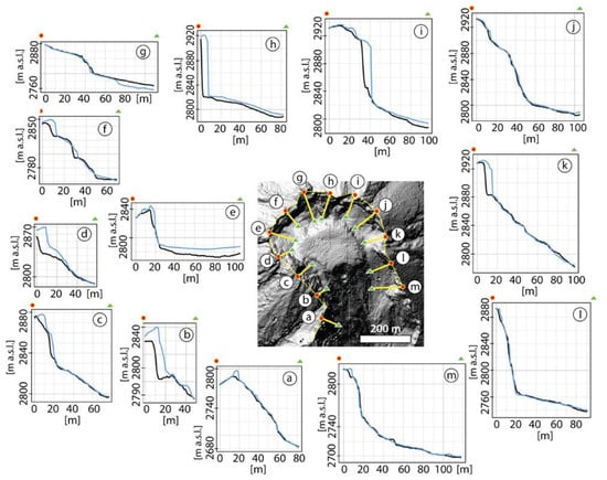 At the summit of Merapi Volcano, a horseshoe crater rim traps the dome. During the period 2012–2014, the crater walls were 100–120 m high above the crater floor at its maximum (from the north to the east–southeast sector), while the west and north sectors present a topographic range of 40–80 m (Figure 3). The crater is open to the south. During the period 2012–2014, the evolution of the crater rim around the dome was generally stable (no large collapse), although the data shows variation in the geometry of the subvertical walls around the crater rim (b–h, and k in Figure 3). The walls that spread outside of the crater rim seem to be more stable (a,l, and m in Figure 3). At the foot of the crater walls, the topography from 2012 to 2014 was stable overall, showing no major wall collapses, except in e, h, and I (Figure 3), where the floor level increased by >2 m locally. Although the walls seem to show locally large discrepancies between 2012 and 2014 (Figure 3b), the absence of significant deposits at their toes suggests that those are potential artifacts that are examined in the discussion.