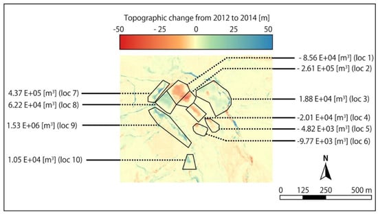 As already reported in the literature, during the period 2012–2014, the dome locally exploded and split into a set of aligned new vents along a north–west–southeast axis. Around the dome, surface changes also occurred with an increase in elevation (Figure 4). The opening of a new vent on the surface of the dome has displaced an equivalent volume of 2.04 × 104 m3, corresponding to a maximum −9 m (+/−0.9 m) vertically (location 4 in Figure 4). At the two vents generated to the north and south of the dome, the volume changes are 8.56 × 104 m3 at location 1, 2.61 × 105 m3 (location 2), and 4.82 × 103 m3 at location 5 (Figure 4). The variability is mostly controlled by the visual depth of the openings (if obstructed by debris, they appear shallower). Therefore, those values need to be considered as minimal values. Surrounding the plateau created by the dome, loose material is also displaying topographic change. It has mostly increased this time. For the period 2012–2014, the rise of material corresponds to a respective volume change of 1.88 × 104 m3 at location 3 and 6.22 × 104 m3 at location 8. These changes correspond to changes nearing 18 m (+/− 0.9 m) at location 1 and 11 (+/− 0.9 m) m at location 8. On top of these major topographic changes, gravitational collapses have also been observed on the crater rim (location 10) and a small portion to the south of the dome seems to have also collapsed (location 6 in Figure 4).