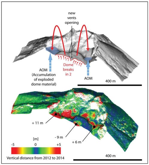 The dome of Merapi Volcano locally exploded during the period 2012–2014, creating a set of aligned vents [], which represent an estimated volume of material of 2.01 × 104 m3 for the central elongated vent at the top of the dome, 2.61 × 105 m3 to the north (high-value determined by good visibility at a depth of almost 30 m below the pre-explosive surface), and one vent to the south, just shy of 1 × 104 m3. The central elongated vent represents a topographic drop of about 9 m (Figure 5), although it is most likely that the opening could have been deeper (filled by either ejecta going back to the vent or the full depth being invisible to the SfM-MVS method due to the narrowness of the vent). The origin of these explosions is the result of pressure increase from the contact with rainwater [] as well as probable material weakening due to hydrothermal alteration, a process that was observed at the dome summit and its surroundings at a later date []. Around the dome, the material in at least two locations rose topographically (Figure 5), even without having had major wall collapses that would match this rise. If we work by analogy, the dome of 2011, which is visible between 2012 and 2014, may have grown over other extruded material in the same way that the 2017 dome climbed over the 2011 dome []. The exploded material may have partly escaped the space of the crater rim, but it is most likely that a large portion of it remained inside the crater, with the largest blocks traveling a shorter distance. Despite a measure of the visible volume change (Figure 4), it is difficult to link both the post-phreatic explosion holes to the deposits for the following reasons: (1) Due to decompression and deposit bulk density changing from that of the dome, the measured volume change does not reflect a material volume change; (2) Part of the material escaped the crater rim; (3) The post-explosion holes will have certainly collapsed; (3) For the deepest part of the holes, ALS or SfM-MVS may not record the real “bottom”. This shows the necessity to develop a methodological framework that is more adapted to volcanic vent surveying due to the numerous complexities it holds.