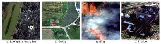 - Low spatial resolution: To better study the impact of low spatial resolution on image classification, we constructed a series of degraded data with low spatial resolution. The source images were downsampled according to the resolution reduction ratio () and then upsampled to the same size as the original images for display. The whole process can be described as:where g denotes the interpolation kernel, stands for the sampling function and its two parameters are used to control the sampling process. Given the resolution reduction ratio , represents the downsampling process, which transforms the image from to . Conversely, describes the upsampling process, which transforms the image from to since . In the subsequent simulation, the bicubic kernel [83] was chosen and the resolution reduction ratio was selected as 81%, 64%, 49%, 36%, 25%, and 16%. Clearly, the spatial resolution decreases as decreases, and the image becomes more and more blurred in the visual display.