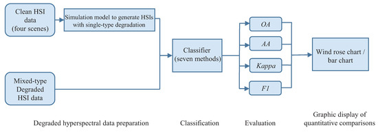 The remainder of the manuscript is organized as follows. In Section 2, we briefly overview the related work of HSI classification and HSI degradation. Section 3 mainly introduces the proposed analysis framework, including the preparation of the degraded HSI data, training and testing methods, evaluation indices, and experimental settings. In Section 4, experimental results are shown and the effects of degraded HSI data in classification are analyzed in the order of single-type degradation and mixed-type degradation. Further discussions are provided in Section 5. The last section provides brief conclusions and recommendations on dealing with classification in practical scenarios and developing target classification methods.