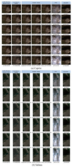 Although HSIs are usually subject to a variety of image degradations in real situations, the method of controlled variables was selected to carry out separate simulation experiments on different types of image degradation, so as to better illustrate the effects of degradation types and degradation levels on HSI classification. In our experiment, we set six degradation levels for each degradation type. Figure 4 shows the hyperspectral data with five tested single-type degradation for six degradation levels by taking Cuprite and Salinas as examples.