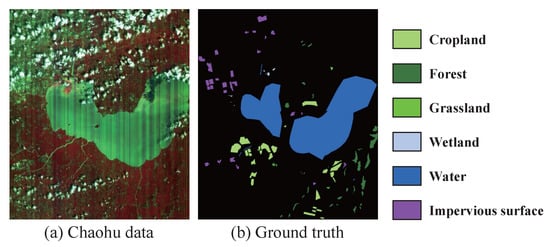As for the hyperspectral data of mixed-type degradation, we selected a real degraded HSI called the Chaohu data. The Chaohu data were captured by the Zhuhai-1 satellite, which covered the areas around Chaohu Lake in Anhui, China. These data contain 5865 × 5010 pixels with a geometric resolution of 10 m. There are 32 bands that can be downloaded. As shown in Figure 5a, there is a mixed-type image degradation in the Chaohu data, including Gaussian noise, stripe noise, cloud, and shadow. For the sake of completeness, we labeled the Chaohu data manually referring to the global land cover FROM-GLC10 data (Download link: http://data.ess.tsinghua.edu.cn/fromglc2017v1.html (accessed on 1 September 2022)) and high spatial resolution images from Google Earth. According to the classification system of FROM-GLC10, we interpreted the Chaohu data into six categories, i.e., cropland, forest, grassland, wetland, water, and impervious surface (see Figure 5b). The total number of labeled pixels was 4,670,717.