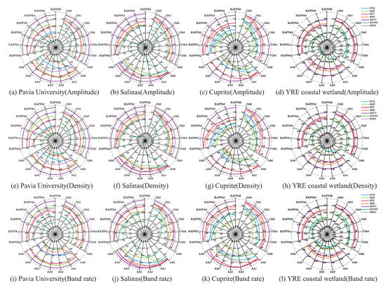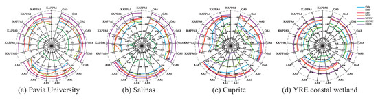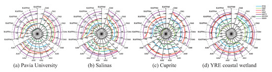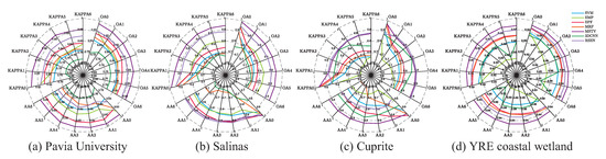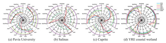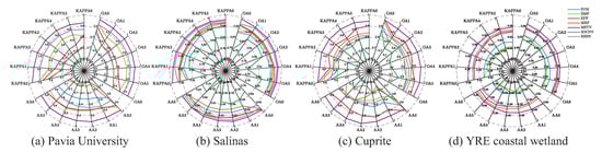 For the convenience of comparison and analysis, we graphically display the quantitative evaluation results of hyperspectral data with single-type degradation on a series of wind rose charts, where lines in different colors represent different classification methods. The three evaluation indices are rotated and arranged in a clockwise direction, and the end character 0–6 represents different degradation levels from low to high. In particular, level 0 reflects the classification performance of comparison methods on clean images. Since we are more concerned with the trend of the curves than with the specific values, the start and endpoints in each wind rose chart may vary slightly to maximize the curve trend.