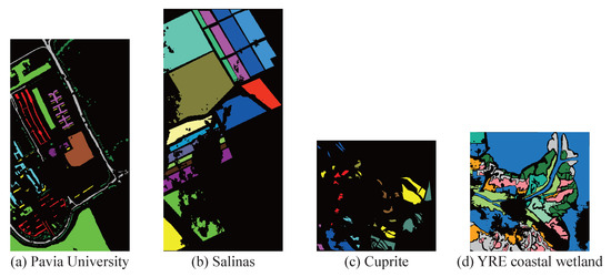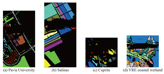 - Cuprite: Cuprite was also acquired by the AVIRIS sensor, covering cuprite mining areas in Las Vegas, NV, USA. Similar to the Salinas data, there also remained 188 bands after preprocessing. A subimage of 479 × 507 pixels that corresponds to the mineral mapping areas of copper mining reported by the spectral Laboratory of the United States Geological Survey (USGS) [81] was selected for later tests. The ground truth was drawn manually according to the released map (download link: http://speclab.cr.usgs.gov/PAPERS/tetracorder/ (accessed on 1 September 2022)), and was labeled with eight classes, including Alunite, Kaolinite, Calcite, Muscovite, etc. Consistent with the released map, there also exist categories containing two or three kinds of mixed minerals in the manually interpreted ground truth. The total number of labeled pixels is 33,302.