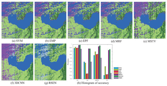 - Markov random field (MRF) [86]: A Markov random field (MRF) is also a postprocessing spectral–spatial method. Different from EPF, its probability map is optimized through the model of a Markov random field. Specifically, the class of a pixel is determined jointly by the output of the pixelwise classifier, the spatial correlation of adjacent pixels, and the solution of a MRF related minimization problem.