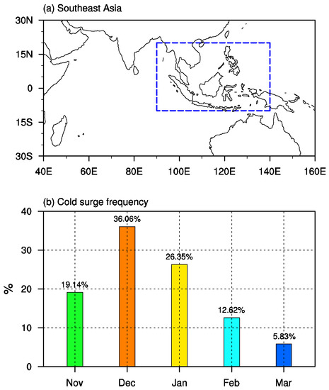 (a) Study area of Southeast Asia (10°S–20°N, 90°–140°E) indicated by the blue rectangle. (b) Frequency distribution (unit: %) of cold surge days for each winter month during 1998–2018.