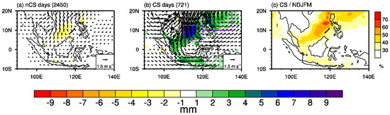 In order to reflect the importance of cold surges on Southeast Asian rainfall during NDJFM, the rainfall anomalies were composited with the exclusive and inclusive cold surge days and are shown in Figure 2a,b, respectively. Without cold surges, only a weak decrease in rainfall occurs in north of Borneo (NBO) and northeast of the Philippines, which is accompanied by the anomalous southerly winds over the South China Sea (Figure 2a). In contrast, the presence of cold surges causes the strengthened northeasterly winds that originate from the South China Sea to penetrate into the south of Sumatra and then cross the equator by shifting counterclockwise (Figure 2b). The northeasterly winds, on the one hand, are parallel to the west coastline of Borneo and are associated with an enhanced shear vorticity, resulting in the strengthening of the Borneo vortex (Figure 2b). On the other hand, they are perpendicular to the mountain terrains of the northern Philippines and Malay Peninsula. Under the circulation configuration, notable increases in rainfall occur east of the Philippines (EPH), north and west of Borneo, east of southeastern Sumatra, near the southeastern Malay Peninsula, and over the Java Sea (Figure 2b). The rainfall anomalies over Southeast Asia that are associated with cold surges have two centers, one over the EPH (10°–20°N, 120°–135°E) and the other over the NBO (5°–12.5°N, 110°–120°E). These results indicate that cold surges are the primary driver for winter rainfall over Southeast Asia on a synoptic scale, and they can explain greater than 50% and 40% of the total NDJFM precipitation over the NBO and the Philippines Sea (Figure 2c), respectively.
