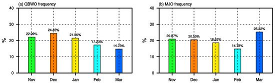 Frequency distribution (unit: %) of (a) QBWO days in phases 6–8 and (b) MJO days in phases 2–4 for each winter month during 1998–2018.