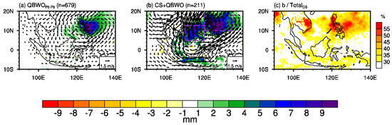 The QBWO over the WNP could change the CSR over Southeast Asia by directly modulating the environment to be more advantaged or disadvantaged for convections or by indirectly altering the cold surge activity through the consistent or opposite wind over the South China Sea. To elaborate on this, Figure 5a,b shows the composite rainfall and wind anomalies over Southeast Asia during phases 6–8 of the QBWO and during the days it co-exists with cold surges, respectively. The active QBWO is associated with a significant enhancement of rainfall over the EPH and is accompanied by a strong cyclonic circulation and low-level convergence surrounding the Philippines (Figure 5a). The northeasterly winds over the South China Sea are associated with the QBWO’s cyclonic circulation and could strengthen the southward invasion of cold surge winds. Anomalies in rainfall and circulation for days when the QBWO and a cold surge co-occur (Figure 5b) are dominated by the effects of the cold surge (Figure 2b); however, the presence of QBWO partly strengthens the CSR over Southeast Asia, especially over the EPH (Figure 5b). The co-occurring event can explain more than 45–50% of the total CSR amount over the EPH and more than 50% over the southeastern Indo-China Peninsula (Figure 5c). Hence, it confirms the strengthened effects of the QBWO over the WNP on Southeast Asian CSR.