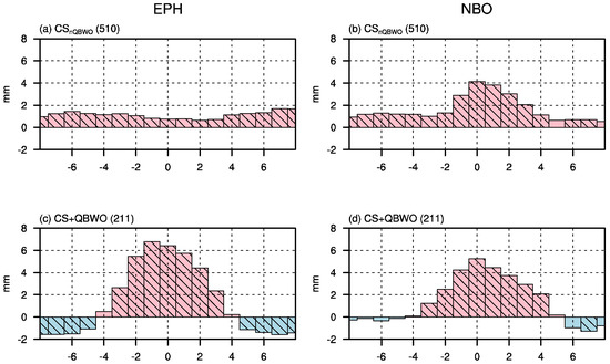 Composite daily evolution of area−mean precipitation over the EPH (10°–20°N, 120°–135°E; left panel) and over the NBO (5°–12.5°N, 110°–120°E; right panel) during cold surge days (a,b) without and (c,d) with the QBWO, respectively. Number in left title indicates the composite days. Values exceeding the 95% confidence levels based on the two-tailed Student’s t-test are shown as oblique lines.