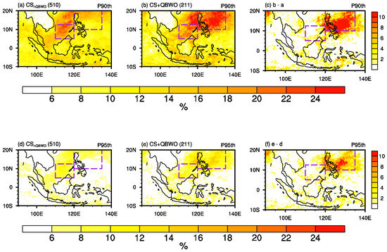In addition to the seasonal mean precipitation, the impacts of cold surges on Southeast Asia could also be reflected by extreme rainfall [17,37,38]. Thus, we further indicated the spatial distribution of rainfall probability over Southeast Asia, which surpasses the 90th and 95th percentile extreme threshold in NDJFM (Figure 8), and is forced by cold surge days with or without the QBWO. The threshold of extreme rainfall is defined as the 90th or 95th percentile at each grid for each NDJFM calendar day. The percentile thresholds are based on a centered 5-day window from 1998–2018 to produce a reasonable sample size. Then, an extreme day is detected when the rainfall in a day is above the threshold. The results show that a higher probability of extreme rainfall that exceeds a specific threshold is expected to occur over the areas with a higher mean rainfall (Figure 6c,g,k). During the cold surge days without the QBWO, the rainfall probability surpassing the 90th (95th) threshold is approximately 16% and 20% (8% and 10%) over the EPH and NBO (Figure 8a,d), respectively. When the QBWO over the WNP co-exists with a cold surge, there is a significant increase in the extreme rainfall probability over the EPH (Figure 8b,e). The increases in the 90th and 95th thresholds are above 10% and 8% (Figure 8c,f), respectively. Therefore, phases 6–8 of the QBWO make the environment more favorable for convection development over the EPH by facilitating conditional instability and moisture convergence surrounding the Philippines (Figure 5a); this can result in significantly increased CSR over the EPH and leads to a higher likelihood of triggering extreme rainfall compared to a cold surge alone. In contrast, the changes in the probability of experiencing extreme rainfall over the remaining regions of Southeast Asia are less directly influenced by the QBWO.