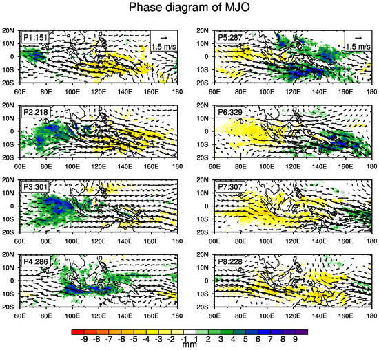 As the primary members of ISO during winter, both the QBWO and the MJO have substantial impacts on CSR over Southeast Asia. It is necessary and essential for us to compare these two ISO modes. The MJO is an eastward-propagating oscillation from the tropical Indian Ocean to the tropical central Pacific, with its convectively active phases impacting the rainfall distribution over Southeast Asia (Figure 9). It is accompanied by the Kelvin wave response of easterly (westerly) wind anomalies and Rossby wave response of cyclonic (anticyclonic) circulation to the east and to the northwest of the active (suppressive) convection, respectively. During phase 1, there is a southerly wind anomaly associated with the MJO that appears over the northern South China Sea. It then evolves into expansive southwesterly winds during phases 2 and 3. Subsequently, the wind anomaly gradually becomes the northerly wind and persists through phases 6 and 7. In the equatorial region of Southeast Asia, the easterly anomaly is observed during phases 1–3, and the westerly anomaly occurs during phases 5–7. The resulting circulation pattern is consistent with the evolution of the active and suppressed convections that are represented by the rainfall anomalies. In this study, we focus on MJO phases 2–4, in which the MJO-related rainfall anomalies are active over Southeast Asia [13,27]. The frequency distribution of the MJO during phases 2–4 for each winter month is shown in Figure 4b. Its activity peaks in March, in which cold surges and the QBWO begin to weaken (Figure 1b and Figure 4a). Hence, compared with the QBWO, the active MJO may superpose less cold surge days during an extended winter.