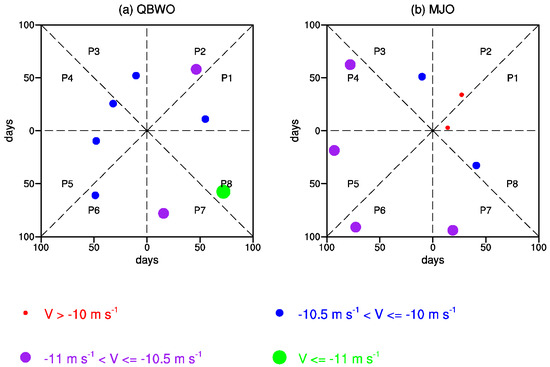 Two−dimension distribution of frequency (unit: days) and intensity (unit: ms−1) of cold surges during different (a) QBWO phases and (b) MJO phases. Frequencies of cold surges during phases 1–8 and phases 4–5 (phases 2–3 and phases 6–7) of ISO modes should be referred to the values in x-axis (y-axis). Intensity of cold surges is defined as the 925 hPa meridional winds averaged over the South China Sea between 110°E and 117.5°E along 15°N. Different intensities are indicated with dots in different colors and sizes.