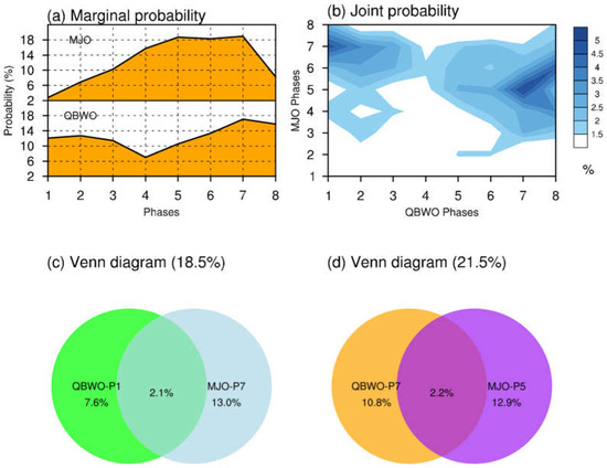 Apart from the influences on CSR, the cold surge activity could also be changed by these two ISO modes via the consistent or opposite dynamic structures over the South China Sea. To measure this possibility, Figure 12 shows the two-dimensional distribution of cold surge frequency and intensity during eight QBWO and MJO phases individually. Under the background of the QBWO, cold surges occur more frequently during phases 6–8 than the remaining phases (Figure 12a), with stronger surge winds during phases 7–8 due to the stronger northeasterly winds over the South China Sea that are associated with the QBWO (Figure 3). When the MJO exists, cold surges tend to occur more frequently (infrequently) during phases 5–7 (phases 1–2) with a higher (lower) surge wind intensity (Figure 12b). As a result, phases 5–7 (phases 1–2) of the MJO are the most preferred (unpopular) phases for the occurrence of cold surges, with a probability of about 56.05% (9.67%). The counterpart phases in the QBWO are phases 6–8 and phases 4–5, having probabilities of about 46.28% and 17.54% (Figure 13a), respectively. In addition to the separate co-occurrences of individual ISO modes with cold surges, the co-existence of both ISO modes for modulating the occurrence of cold surges was also investigated. This can be understood by a joint probability distribution (Figure 13b); it shows that the most probable phases for the occurrence of cold surges are the time when phase 1 of the QBWO co-exists with phase 7 of the MJO or the time when phase 7 of the QBWO couples with phase 5 of the MJO. The former combination may be dominated by the MJO, while the latter is dominated by both the QBWO and the MJO (Figure 13a). The joint probability signifies the fact that the favorable phases of only one type of ISO mode may not be the most conducive time for the occurrence of cold surges over the South China Sea. In fact, about 2.1% of the total cold surge days are linked with the time when phase 1 of the QBWO couples with phase 7 of the MJO (Figure 13c), and roughly 2.2% are associated with the time when phase 7 of the QBWO is consistent with phase 5 of the MJO (Figure 13d). These percentage values may seem smaller at a glance, but they represent the fact that out of (8 × 8) 64 combinations of ISO phases, only two capture 2.1% or 2.2% of the occurrence of total cold surge days, indicating the rare event when the QBWO, MJO and a cold surge are concurrent. A Venn diagram [39] suggests [supposing A and B be two arrays and n being the cardinal number: ] that about 18.5% of the total cold surge days would fall within either phase 1 of the QBWO or phase 7 of the MJO (Figure 13c), and about 21.5% would fall within either phase 7 of the QBWO or phase 5 of the MJO (Figure 13d). Accordingly, a sum of 40% of the total cold surge days could occur in either combination.