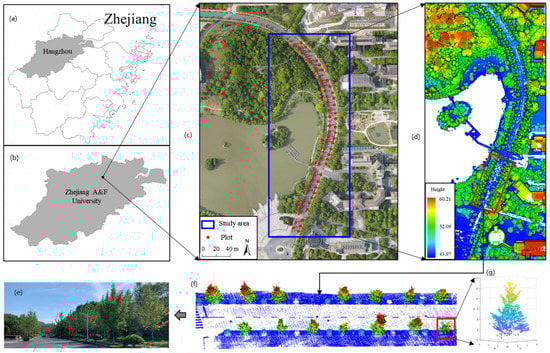 Overview of the study area. (a) location of Hangzhou, (b) location of the study area, (c) aerial photograph of the study area, (d) ULS point cloud of the study area, (e) ground image of ginkgo, (f) ULS point cloud of ginkgo, (g) point cloud of a single tree of ginkgo.