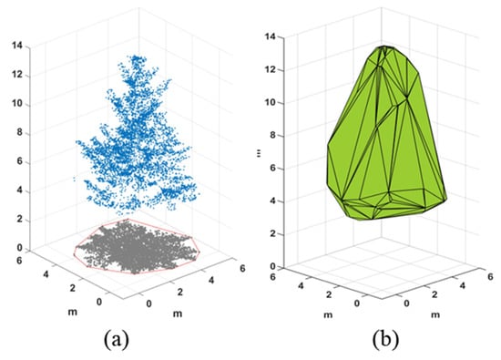 A convex hull is a concept in computational geometry defined as finding a minimal set of points such that the shape formed by the set of points can contain all points in the 2D plane or 3D space [34]. Figure 2a shows a schematic diagram of the 2D convex hull. In this study, the point cloud of a single tree canopy is projected to the 2D plane, the 2D convex hull is calculated, and the projected area of the canopy is extracted based on the convhull function in MATLAB. Figure 2b shows the results of the convex hull algorithm in 3D space, based on the quickhull algorithm to reconstruct the canopy surface and calculate the volume under the convex hull, i.e., the 3D green volume [20].