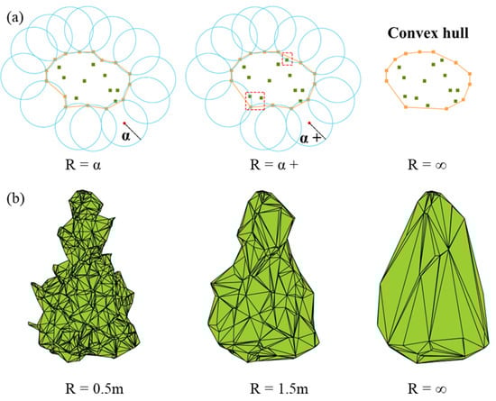 The concave hull algorithm is another common geometric calculation method, which can be understood as an additional parameter alpha that can be set on top of the convex hull, with alpha as the diameter of the circle rolling along the boundary of the convex polyhedron. The trajectory of the rolling circle is the boundary of the concave polyhedron [19], so the method is also called alpha shape. The algorithm is shown in Figure 3a. The process of reconstructing the shape of the tree crown in the 3D concave hull does not connect vertices that are too far apart, as in the 3D convex hull. If alpha tends to infinity, the concave hull result is infinitely close to the convex hull, while a smaller alpha tends to be concave at a certain position to fit the shape of the point set more closely [35,36]. The results of the concave packet algorithm with different parameters on a tree are shown in Figure 3b. In this study, we set the alpha range as 0.1–5 m, took 0.1 m as a step and calculated the RMSE with measured 3D green volume to select the optimal scale.