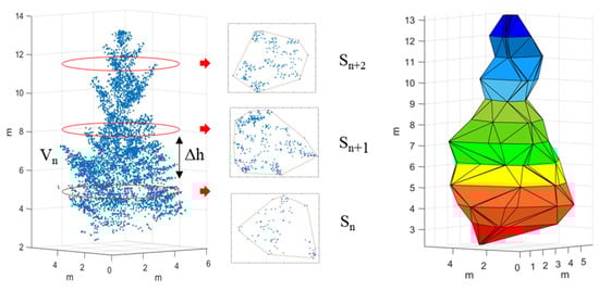 The convex hull by slices algorithm is based on the idea of integration. First, the canopy is sliced according to the uniform thickness, and each layer is considered a table body. For each layer, the point clouds within 0.2 m of each plane are counted, these point clouds are projected to the same plane, and the projected area of the plane is calculated using the 2D convex hull algorithm. Then, the table product formula is used to calculate the volume of each layer. Finally, all the slice volumes are summed to obtain the 3D green volume (Figure 4) [27,37]. The convex hull by slices algorithm sets the height difference in the range of 0.1–5 m with a step of 0.1 m, and calculates the RMSE with measured 3D green volume to select the optimal scale. The volume of each layer of the table is calculated as follows: