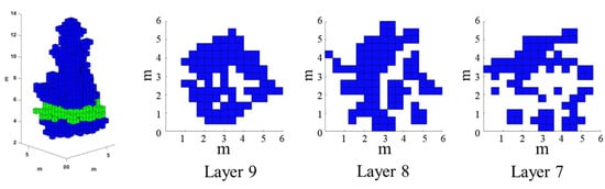 Single tree voxel profile analysis (Layer 7, Layer 8, Layer 9 shows the horizontal section of the tree at a crown height of 2.8 m, 3.2 m, and 3.6 m).