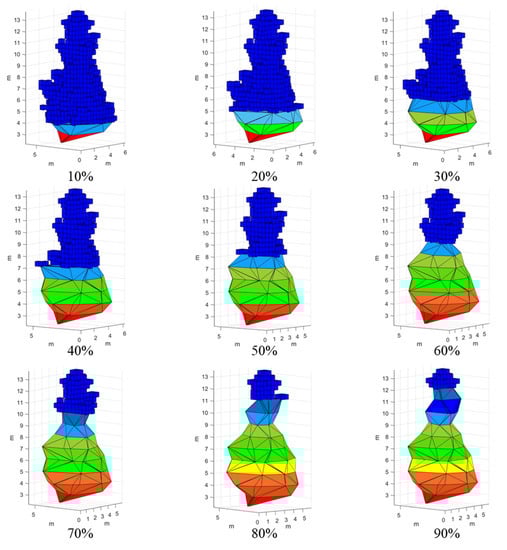 Based on the above analysis, a new algorithm for 3D green volume estimation, named voxel coupling convex hull by slices, is proposed in this study. The method calculates the 3D green volume by dividing the single tree canopy point cloud into two parts according to height, and the volume of the upper canopy point cloud is calculated using the voxel algorithm, to prevent the calculation error of the upper layer caused by uniform thickness slicing, while the volume of the lower canopy point cloud is calculated using the convex hull by slices algorithm, to prevent the calculation error of the green volume caused by the missing point cloud of the lower layer (Figure 7). To explore the optimal stratification ratio, this study set the stratification range, from 10% to 90%, with a step size of 10%, extracted the 3D green volume of each stratification, and calculated the RMSE with measured 3D green volume to select the optimal scale. The computational equations of this new method are shown below: