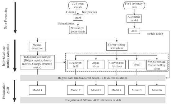 LiDAR can accurately extract structural parameters, such as crown projection area, crown diameter, and crown height, which makes it advantageous for single-tree AGB estimation [21,22,23]. Three dimensional green volume characterizes the volume of space occupied by plants. Therefore, the participation of 3D green volume in the estimation of AGB has attracted extensive attention from scholars. For example, Tao et al. [24] showed that a 3D green biomass incorporation model could more accurately estimate the AGB (R2 = 0.77, RMSE = 179.0 Mg/ha). Hauglin et al. [6] estimated the AGB of a single tree plant based on TLS extraction of voxelization parameters with higher accuracy than conventional anisotropic growth models (R2 = 0.88, RMSE% = 32%).