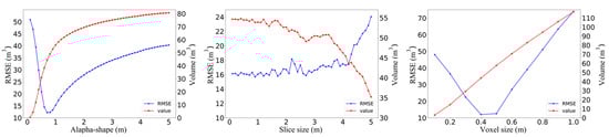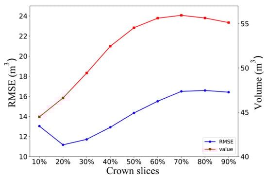 Figure 9 shows that in the alpha shape algorithm, as the alpha parameter increased, the 3D green volume also became larger, and the alpha value tended to stabilize after 2 m. The RMSE showed first a decreasing and then an increasing trend, with a peak at the 0.6 m scale, and tended to stabilize after the alpha value was greater than 1.3 m. The RMSE under this scale was 12.20 m3. The overall trend of the 3D green volume obtained by the convex hull by slices algorithm decreased with increasing height interval, and the RMSE did not change regularly, but, overall, the RMSE was higher when the height interval was higher, with a peak at the 0.9 m scale. The RMSE under this scale was 13.01 m3. The 3D green volume obtained by the voxel algorithm increased linearly with increasing voxel size, and the RMSE showed a trend of first decreasing and then increasing, peaking at a scale of 0.4 m. The optimal voxel size was selected as 0.4 × 0.4 × 0.4 m, and the RMSE at this scale was 12.03 m3. Figure 10 shows the results of the voxel coupling convex hull by slices algorithm. As the segmentation scale increased, the RMSE decreased and then increased. The optimal canopy segmentation scale was selected to be 20%, and the RMSE at this scale was 11.17 m3, which was lower than those of the other algorithms.