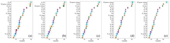 The 3D green volume of single ginkgo trees differed significantly, due to differences in growth. The results of the 3D green volume calculated using the five algorithms, 3D convex hull, 3D concave hull, convex hull by slices, voxel and voxel coupling convex hull by slices, are shown in Table 3. The average 3D green volume and RMSE calculated by the 3D convex hull algorithm was much higher than those calculated by the other models, ranging from 21.22–196.10 m3 (mean = 84.86 m3, RMSE = 45.31 m3). The average 3D green volume calculated by the 3D concave hull was the lowest, ranging from 12.12–74.84 m3 (mean = 37.72 m3, RMSE = 12.20 m3). The convex hull by slices algorithm overestimated 3D green volume, and ranged from 15.16–133.53 m3 (mean = 53.85 m3, RMSE = 13.01 m3), and the 3D green volume calculated by the voxel algorithm ranged from 16.00–81.79 m3 (mean = 43.13 m3, RMSE = 12.03 m3). The average 3D green volume calculated by the voxel coupling convex hull by slices algorithm ranged from 15.58–97.20 m3 (mean = 46.61 m3), and the 3D green volume calculated by this method was the minimum RMSE (11.17 m3).