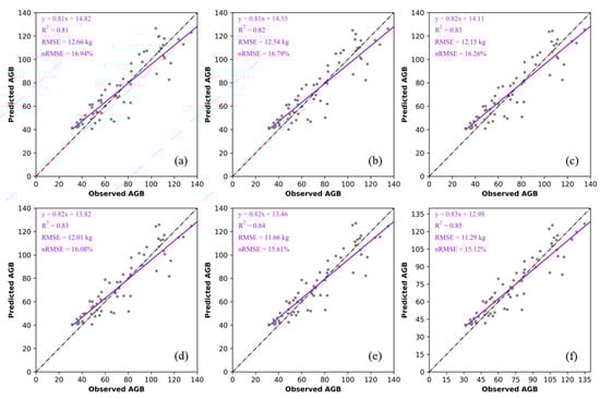 The results of different models predicting single tree AGB are shown in Figure 13 and Table 4. The accuracy of model 1, based on ULS base parameters, was CV-R2 = 0.81, RMSE = 12.66 kg, nRMSE = 16.94%, and the AGBs estimated by models 2–5, with the addition of 3D green volume parameters, were better than that of model 1 (CV-R2 = 0.82–0.85, RMSE = 11.29–12.54 kg, nRMSE = 15.12–16.79%). This indicated that the addition of 3D green volume could significantly improve the estimation accuracy of AGB. Model 6 had the highest accuracy (CV-R2 = 0.85, RMSE = 11.29 kg, nRMSE = 15.12%), with an improvement in CV-R2 of 0.04, a decrease in RMSE of 1.37 kg, and a decrease in nRMSE of 1.82%.