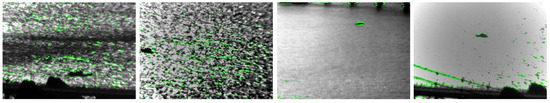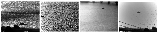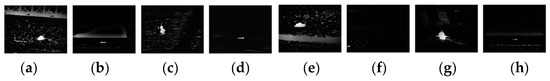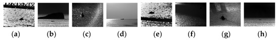 The purpose of the preprocessing algorithm is to suppress the interference of the background and sea waves, thereby enhancing the saliency of the target. Through the representative image processing results in Figure 17, it can be observed that the target and background gray levels are reversed, and the target has a strong gray level. It can be seen from Figure 17a,b,e that the strong background is suppressed and the ocean wave noise is significantly reduced. The lens flare and background reflections are clearly suppressed in Figure 17c,g. The connected dark or bright lines are also eliminated in Figure 17d,f,h.