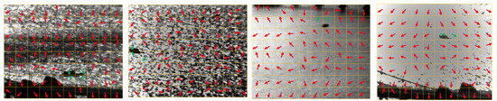Considering that in the actual sea surface target search task, the slight jitter of the imaging system will cause a strong frame jitter. However, the commonly used anti-shake measures are difficult to ensure the complete elimination of the jitter between frames [33,34,35], so it is easy to cause an excessive shift of the target between adjacent frames due to the vibration of the imaging platform, resulting in a missed detection. Therefore, before applying the multi-frame spatiotemporal filtering method, this paper proposes a method of inter-frame jitter position correction, which measures the jitter of adjacent frames through the inter-frame block matching results of the former frame and the current frame. The detailed steps are as follows: