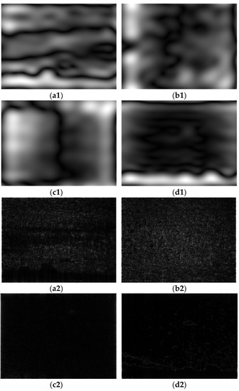 Finally, this article analyzes from the perspective of the frequency domain and applies Fourier transform and inverse Fourier transform technology to process the backlight maritime infrared image. The processing result is shown in Figure 5. The (a1–d1) is high-frequency information and (a2–d2) is low-frequency information.