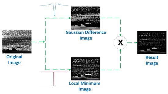 First of all, according to the gray-level feature analysis results, the target is at the lowest gray level. Secondly, according to the results of the frequency domain feature analysis of the image, it is possible to highlight the saliency of the target by filtering out the highest and lowest frequency information, and a Gaussian difference filter is constructed. Finally, the local minimum image and the Gaussian difference filtering result image are multiplied by Equation (4) to generate the required preprocessed image that can improve the saliency of the target. The ORI represents the original image, Min_Conv and GS_Conv represent the local minimum kernel and Gaussian convolution kernel, respectively, PRI represents the preprocessed result image and the preprocessed result image is shown in Figure 7.