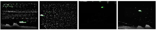 Hypotheses (2) is developed by Equation (9), Norm is the normalized function, F(m,n) is the gray value of the centroid position of the saliency map in the former frame and C(m,n) is the gray value of the centroid position of the saliency map in the current frame. If the suspected target can satisfy the above two hypotheses and achieve continuous inter-frame matching, it is judged as the real target and the OTSU method is applied to segment the target area. Otherwise, it is judged as a false target and the gray value of the current area is cleared. Figure 15 shows seven saliency images selected from a video sequence after an inter-frame jitter position correction. The target area is marked with a green frame, and the two clutter is marked with red and blue, respectively.