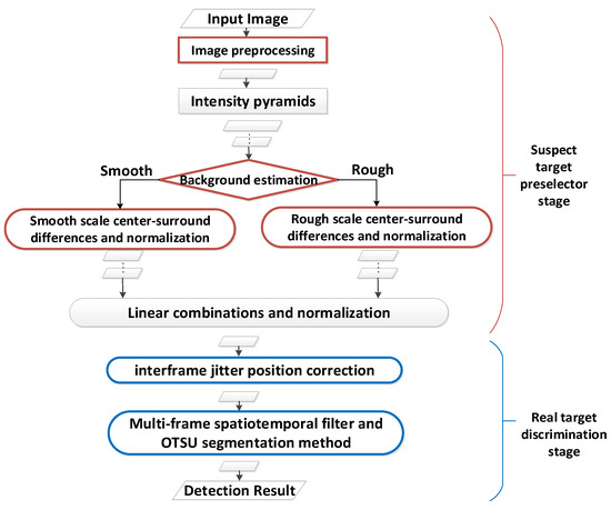 According to the feature analysis, the paper proposes a preprocessing algorithm that can improve the saliency of the target. The overall process is shown in Figure 6.
