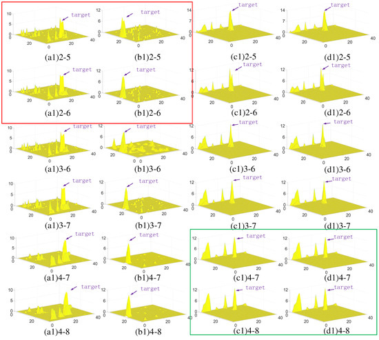 First, according to the analysis results in Section 2.1, the target and the background have similar orientation features, so the orientation pyramid in the VAM is abandoned to decrease the clutter interference and reduce the complexity of the algorithm. Based on the characteristics of the target with a stronger local contrast and global gray after preprocessing, the intensity feature is selected to construct the pyramid. Second, the “center-surround difference” operation has always been a crucial step of the VAM. The core is to perform the difference processing at different scales, and the purpose is to achieve feature extraction. The traditional VAM method is to define the center scale c (c = {2,3,4}) and the surround scale s, where s = c + σ (σ = {3,4}). The result of processing the data set in Figure 1 is shown in Figure 10. It can be found that the saliency of the target under different scale operations is not the same. For the data sets (a) and (b), the “center-surround difference” operation results of the 4–7 and 4–8 layers make the target have the strongest significance, as shown in the green box in Figure 10. However, the results of the 2–5 and 2–6 layers in data sets (c) and (d) make the target the most significant, as shown in the red box in Figure 10. Therefore, a different “center-surround difference” operation should be adopted for infrared images in the MHE. Further analysis found that the data sets (a) and (b) are more unevenly distributed in the local area than the data sets (c) and (d). Therefore, the corresponding “center-surround difference” operation can be selected according to different background intensities to reduce the background interference. The gray scale varies dramatically at multiple locations with non-uniformity in Figure 1a,b. On the contrary, the slow and uniform grayscale change in Figure 1c,d. The intensity standard deviation can effectively characterize the degree of heterogeneity of the background. To avoid the impact of the target and the strong background (bridge), our designs for a random intensity standard deviation method to determine the non-uniformity of the background are shown in Equation (5).