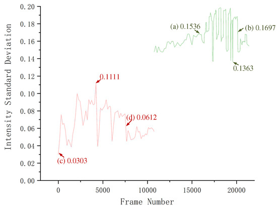 where k represents the number of random samplings of the block regions, Si is the local standard deviation of each block and RISD is the random intensity standard deviation of the entire image. More than 20,000 maritime infrared images under different sea wave intensities are selected, and the statistical results obtained are shown in Figure 11. It can be seen from Figure 11 that the intensity standard deviation of (a) and (b) is significantly higher than that of (c) and (d). The maximum intensity standard deviation of the smooth background is 0.1111.