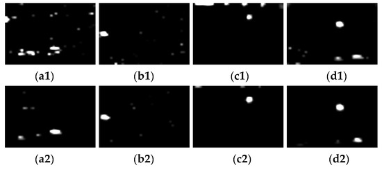 Figure 12(a1–d1) shows the saliency map obtained by applying the VAM proposed by ITTI; (a2–d2) is the saliency maps obtained after the suspected target screening stage. It can be found that the proposed above method significantly reduces the interference of sea waves noise, and also attenuates the saliency of some backgrounds. However, further observation shows that some background interference is still not eliminated after the above-improved method. To solve this problem, this paper proposes a method based on the inter-frame jitter position correction and multi-frame spatiotemporal filtering to judge the suspected target and get the real target. Our proposed three hypotheses are based on the temporal and spatial characteristics of the target.
