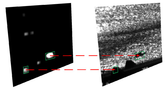Second, the contrast of the entire image is calculated by Equation (3): represents the average gray level of the foreground and represents the average gray level of the background. For the convenience of the observation, the competitive area with the same or a higher local contrast as the target area is marked as green, as shown in Figure 3.
