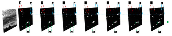 After compensating for the interframes jitter, the sequence image is realigned and the multi-frame spatiotemporal filtering is realized according to the three hypotheses of the target space–time characteristics. This paper applies Equation (8) to develop hypothesis (1), where is the centroid position vector of former frame saliency image, and is the centroid position vector of the current frame saliency image; MaxShift is maximum matching frameshift.