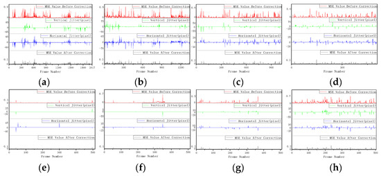 W and H represent the width and height of the image, respectively. Sf and Sc represent the saliency map of the former frame and the current frame, respectively. Since the adjacent frames are acquired in a short period time (our infrared imaging camera is set to 40 frames per second), their saliency maps should be similar to each other. Once dislocation is caused by the jitter between the frames, the MSE between them should be amplified. Figure 19 shows all the correction results of the eight image sequences, including the adjacent frame MSE value before the correction, the amount of inter-frame correction in the horizontal and vertical directions and the MSE values of the adjacent frames after applying the proposed correction method. It can be found that the MSE value after correction is smaller than before correction, especially in the position where the jitter is relatively large, as the maximum MSE value before correction reaches 0.9 and after the horizontal and vertical position correction, the MSE value drops to about 0.2. This proves the effectiveness of the proposed image correction method and achieves the purpose of aligning the image sequence.