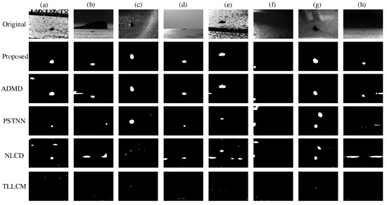 This paper selects four marine target detection algorithms to compare with the proposed algorithm. These algorithms are aimed at the target detection, which are the absolute directional mean difference (ADMD) method [36], partial sum of the tensor nuclear norm (PSTNN) method [37], the novel local contrast descriptor (NLCD) [38] and the multiscale tri-layer LCM (TLLCM) method [39]. The final detection results of each algorithm are compared in Figure 20 (we performed morphological dilation on the results to facilitate observation). The proposed algorithm can overcome strong background interferences such as islands, bridges and connected dark lines, as shown in Figure 20a,b,e. At the same time, it can also be adapted to the sea–sky environment, as shown in Figure 20b,d,h. It can accurately suppress the interference of sea waves with high-brightness characteristics, effectively reducing the generation of false targets, as shown in Figure 20a–c,e,f,h. In addition, when the lens flare and bridge reflection appear in the image, as shown in Figure 20c,g, the proposed algorithm can still accurately locate the target area. These data analysis results also validated the effectiveness of the proposed strategy to detect large and small targets. The ADMD method can accurately detect targets in multiple scenes, the reason is that the ADMD method is based on directional information; false alarms may appear in the strong background area close to the target characteristics, as shown in Figure 20a,b,e,h. The PSTNN method can well eliminate the interference of a strong background and perfectly compensate for the disadvantages of the ADMD algorithm. However, the method to stably detect the target mainly depends on the whether the image satisfies the target sparsity and background low-rank assumptions. The local complex scene will lead to more false alarms, as shown in Figure 20c,f,g,h. For the NLCD method, the backlit image itself has a stronger interference than the other scenes. This method is more sensitive to pixel-sized noises with a high brightness (PNHB), so it produces a large number of missing alarms. The NLCD method is only suitable for backlight scenes with weak ocean waves and strong target textures. For the TLLCM method, the core of the method is to estimate the background so as to filter out the background and extract the target. It can be found that the detection effect is not ideal from the results, only when the target is accurately detected in Figure 20c,g. However, there will be varying degrees of false alarms and missed alarms for other data sets. The reason is that the size of the target is different. Once the background is not estimated, the target will be filtered out.