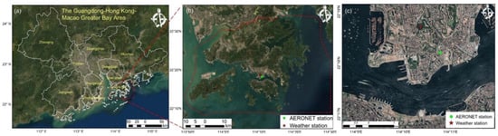 Geographic location of the PolyU AERONET station and King’s Park weather station. (a) The Guangdong-Hong Kong-Macao Greater Bay Area, (b) Hong Kong, and (c) enlarged view of the PolyU AERONET station and King’s Park weather station location.