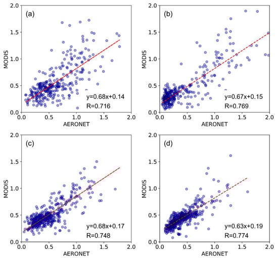 Scatter plots of multi-seasonal MODIS AOD data versus AERONET AOD measurements. (a) Spring, (b) summer, (c) autumn and (d) winter. The red dashed line represents the linear regression line.