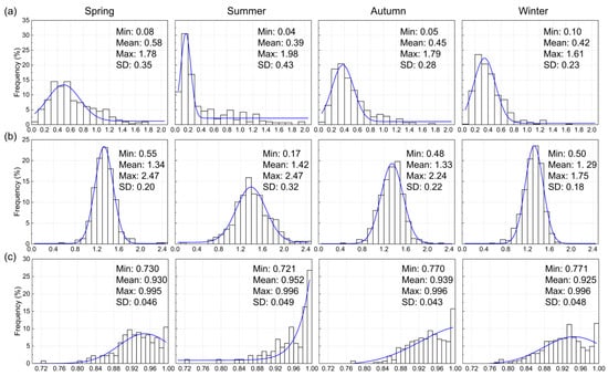 Figure 3 displays the multi-seasonal frequency histogram and corresponding statistical descriptions (i.e., minimum, mean, maximum values and standard deviation) based on daily mean measurements. The AOD has a distinct seasonal variation with a unimodal structure (Figure 3a). The lowest and highest daily average AODs occur in summer with values of 0.04 and 1.98, respectively, resulting in the largest standard deviation (SD) of 0.43. Hygroscopic growth and air stagnation may be responsible for the highest AOD in summer []. A much higher AOD was observed in spring, with about 58% of AOD levels above 0.5. Summer, autumn and winter have lower AOD values, especially in summer, when almost 50% of AOD is below 0.3. Thus, spring has the largest mean AOD (0.58), followed by autumn and winter. This may be attributed to long-distance dust and biomass-burning sources, as well as rapid production mechanisms by secondary aerosols []. Summer has the lowest mean AOD, as the prevailing wind is southerly in summer, bringing clean air from the South China Sea []. Additionally, there is a large amount of rainfall in summer, which can scavenge the pollutants and cleanse the atmosphere [].