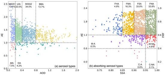 Two aerosol type classification schemes based on the daily measurements of PolyU AERONET station. (a) Aerosol types (MIXA: mixed aerosol; BBA: biomass-burning aerosol; MA: marine aerosol; DA: dust aerosol; UIA: urban/industrial aerosol); (b) absorbing aerosol types (C-A: coarse absorbing; C-NA: coarse non-absorbing; M-A: mixed absorbing; M-NA: mixed non-absorbing; FSA: fine slightly absorbing; FMA: fine medium absorbing; FHA: fine highly absorbing; FNA: fine non-absorbing).